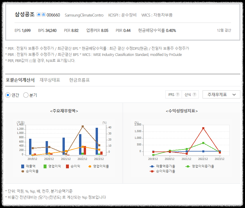 -2023년 12월 전년동기 대비 연결기준 매출액은 31.5% 증가, 영업이익은 37.7% 감소, 당기순이익은 66.2% 감소. 전기 말에 인수한 삼성다이나에이치백(주)의 사업결합 효과로 연결매출액이 크게 상승. 단 원가율 상승과 판관비, 인건비 등 비용 증가에 따라 영업이익은 감소. 프리미엄 친환경차 수출 전략에 힘입어 수출 사상 최고치 기록. HVAC이라는 새로운 제품이 추가되어 생산 제품군 또한 더 다양해짐