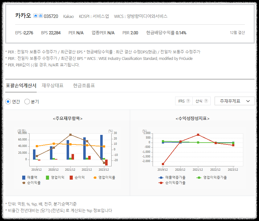 -2023년 12월 전년동기 대비 연결기준 매출액은 11.2% 증가, 영업이익은 19.1% 감소, 당기순이익 적자전환. 카카오 본체사업의 성장세 유지, 종속회사들의 실적개선으로 매출액은 증가하였으나, 영업권손상 및 PPA무형자산 손상차손 인식으로 당기순손실 기록. 2023년 12월 기준 카카오톡 국내 월간 활성 이용자수는 4,800만 명을 기록, 전 국민 플랫폼의 위치를 공고히 하며 종합 커뮤니케이션 서비스로로 진화 중임.