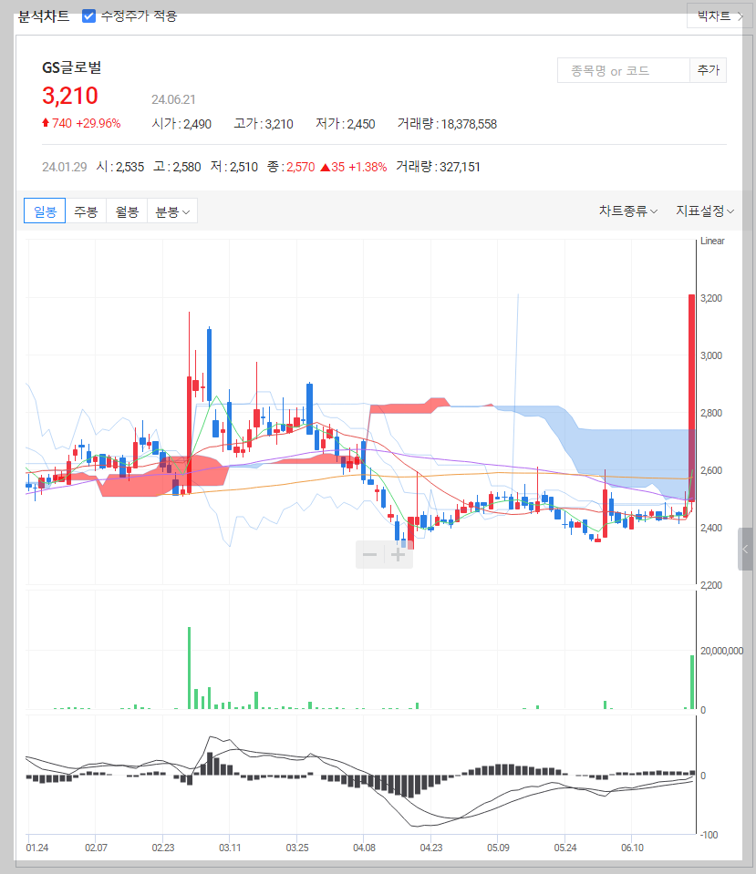 GS글로벌 현재 주가는 3,210원이며 전일 대비 740원 상승한 모습을 보이고 있습니다. GS글로벌의 주주현황을 살펴보면 GS 주주가 전체 지분 50.78%를 소유하고 있습니다. GS글로벌은 무역 기업으로 장중 기준으로 주가는 3,210원입니다. GS글로벌의 시가 총액은 2649억 원이며 발행 주식수는 82,533,764주입니다. 외국인 보유 비중은 4.03%이며 장중 거래량은 18,467,285원 을 기록했습니다. 매출액은 9,622억 원을 달성했습니다. EPS는 336원이며 GS글로벌 주식 배당수익률은 0.78%입니다.