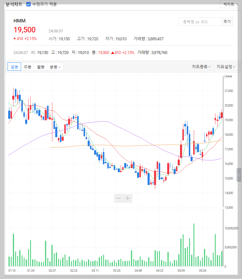 HMM 전일 주가는 19,090원이며 전일 대비 410원 상승한 모습을 보이고 있습니다. HMM의 주주현황을 살펴보면 한국산업은행 주주가 전체 지분 29.20%를 소유하고 있습니다. HMM는 해상운수 기업으로 장중 기준으로 주가는 19,090원입니다. HMM의 시가 총액은 13조 4363억 원이며 발행 주식수는 709,039,496주입니다. 외국인 보유 비중은 10.81%이며 장중 거래량은 2,942,135원 을 기록했습니다. 매출액은 23,299억 원을 달성했습니다. EPS는 2,932원이며 HMM 주식 배당수익률은 3.58%입니다.