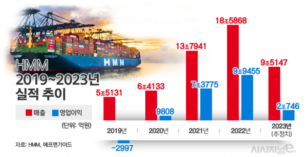 -2023년 12월 전년동기 대비 연결기준 매출액은 54.8% 감소, 영업이익은 94.1% 감소, 당기순이익은 90.4% 감소. 컨테이너선 시장은 2022년 하반기부터 본격화된 운임의 약세가 2023년에도 이어지며, 매출액 및 영업이익률이 하락함. 미국 고금리 및 경기침체로 인한 수요 감소와 대규모 신조선 유입으로 인한 공급 증가 영향으로 컨테이너 시황은 전반적으로 하방 압력을 받을 것으로 전망됨.